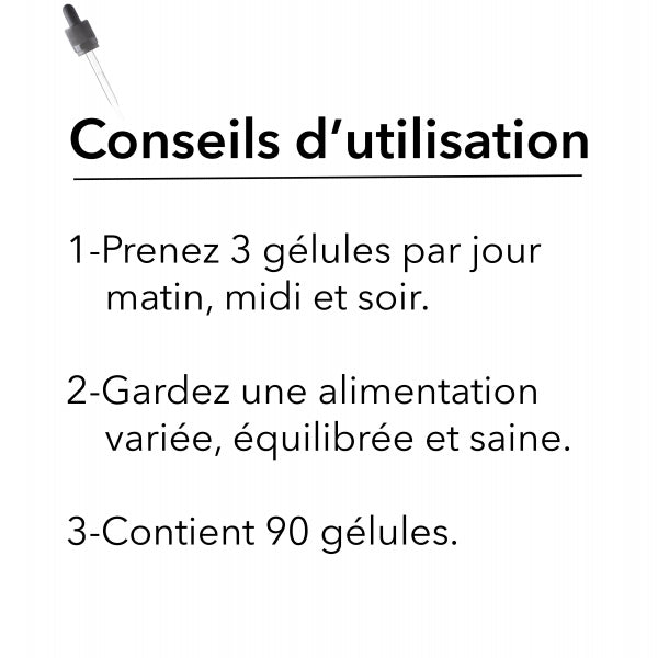 Prenez 3 gélules par jour matin, midi et soir accompagnées d’un verre d’eau.